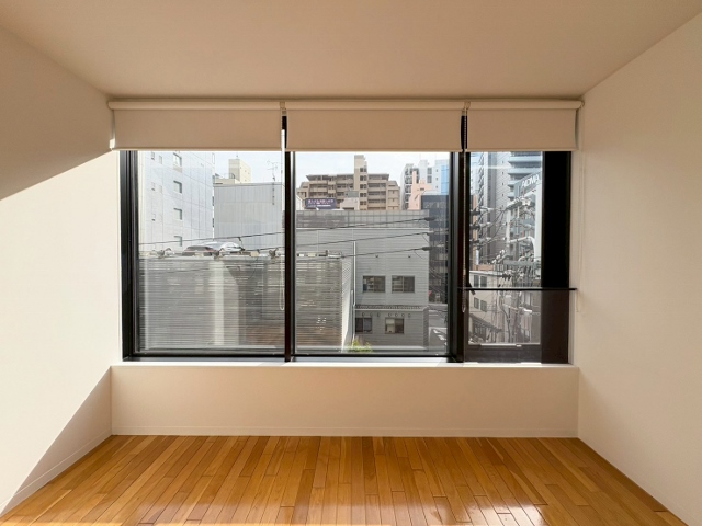 濃いブラウンウッドの床に大きな窓で日当た...